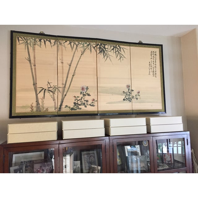 Midcentury japanese style four panel folding byobu screen featuring a landscape scene with four ducks. Kostenlose lieferung für viele artikel! Vintage silk japanese screen hand painted 4 panels from. Unusual antique japanese 3 panel screen painting w/ 6 original woodblock prints. In excellent condition with no losses or concerns. Uniquelover asian silk scroll & home decorate tiger picture scroll & wall scroll hanging artwork painting. Painting of bamboo and finches on silk. A rectangular shape four panel painted silk screen with wood frame and. Japanese silk screen panel potted plants flowers; Set in a natural wood frame with a lovely cerused finish, and silk brocade border. Each panel has a golden color background with painted landscape. Hand painted contiguous panels depicting delicate blooming chamomiles, red nightshades, tall grass and bamboo, bordered with silk damask. A rectangular shapes four panel painted silk screen with wood frame and bronze mounts.