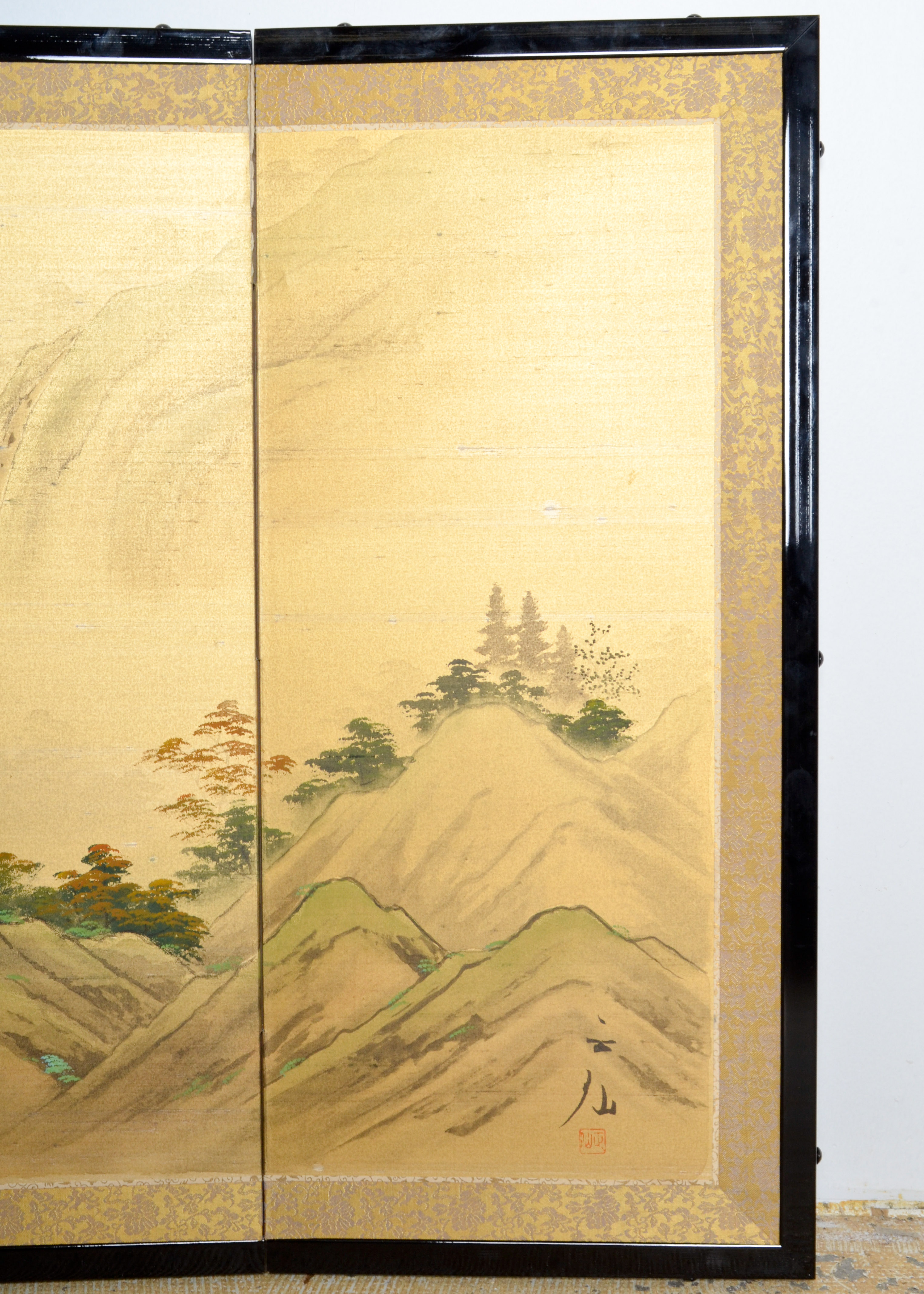 Vintage japanese silk byobu 4 panel folding painting signed asian. Ink and color pigments on paper. The frame is wood with black lacquer. Ink on silk japanese, edo period, 1834 museum of. Has a silk damask border.
